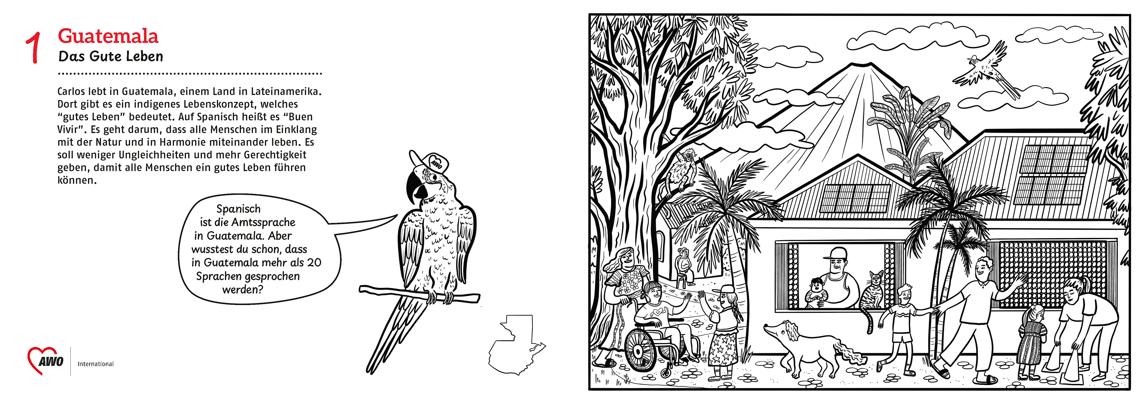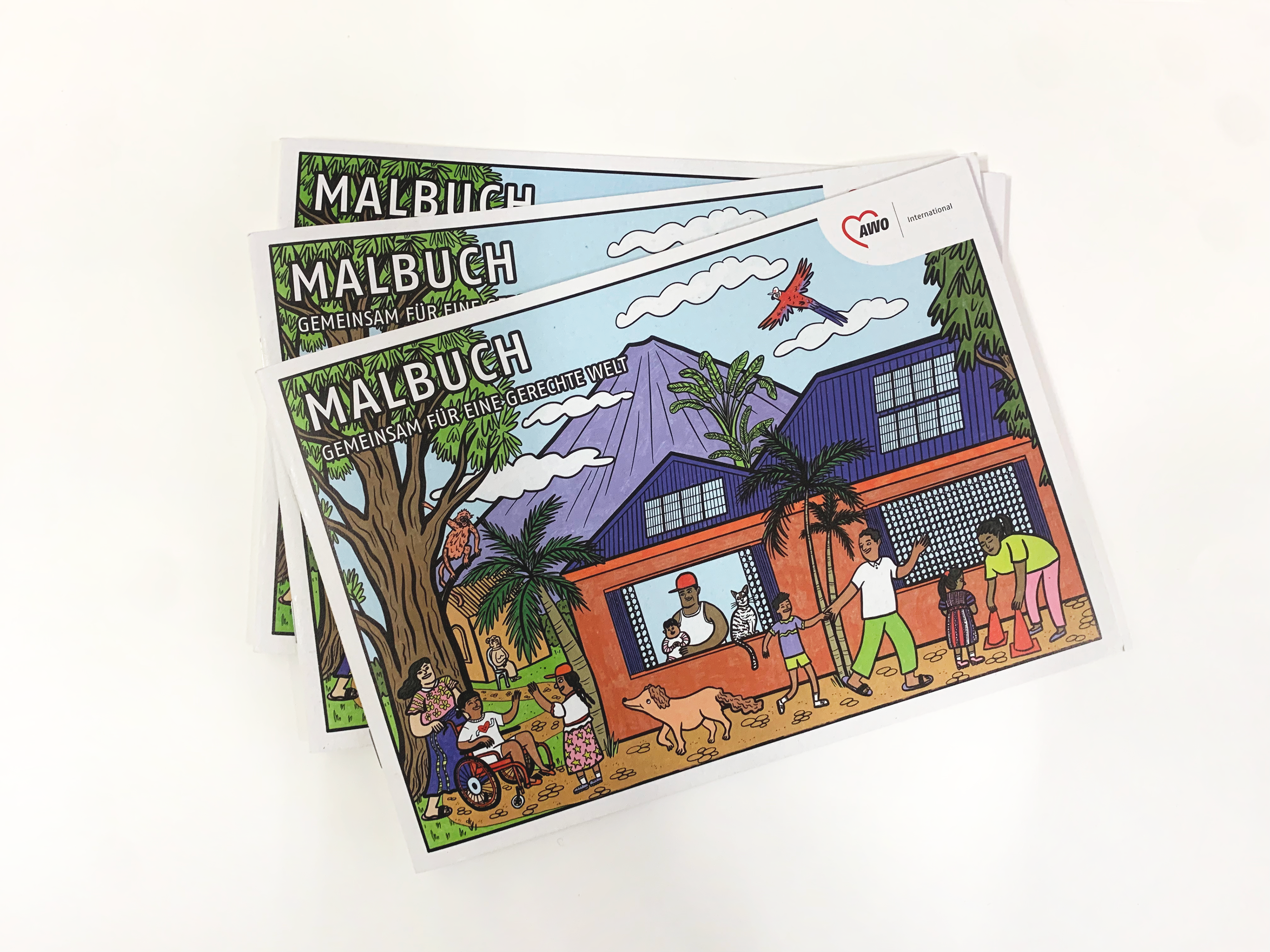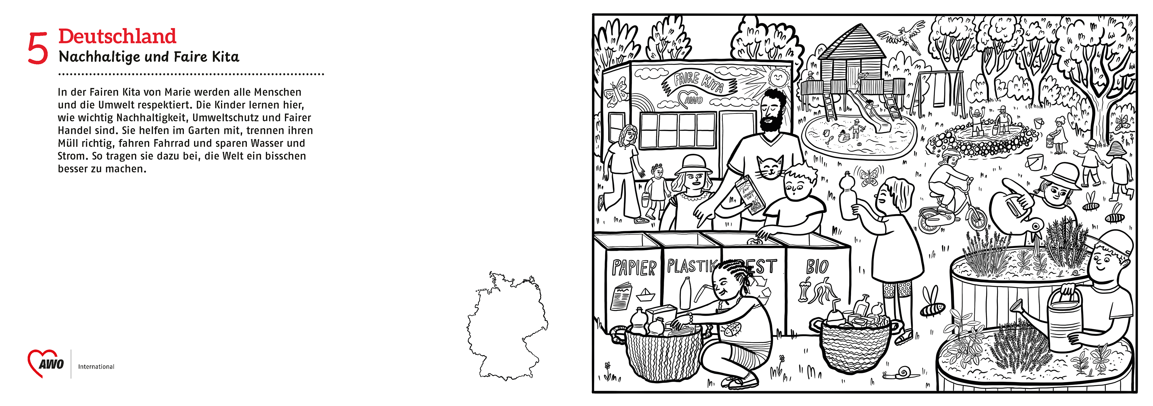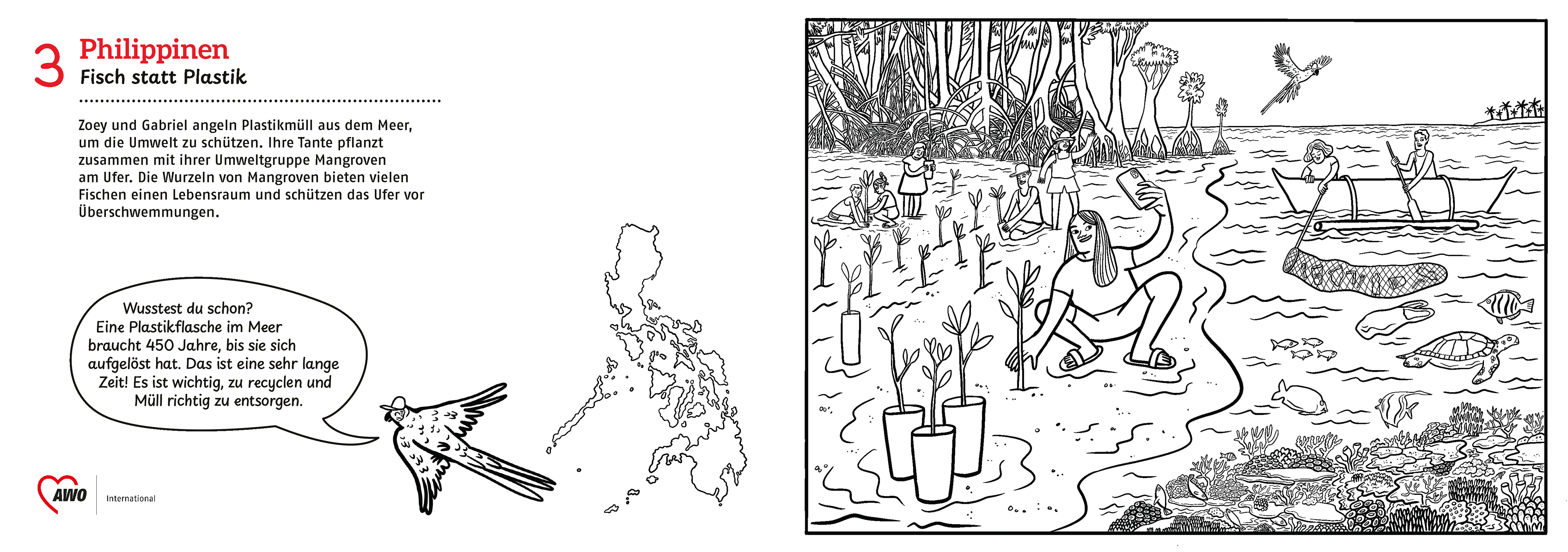 mit Illustrationen, die auf Projekte der AWO International e.V. basieren.