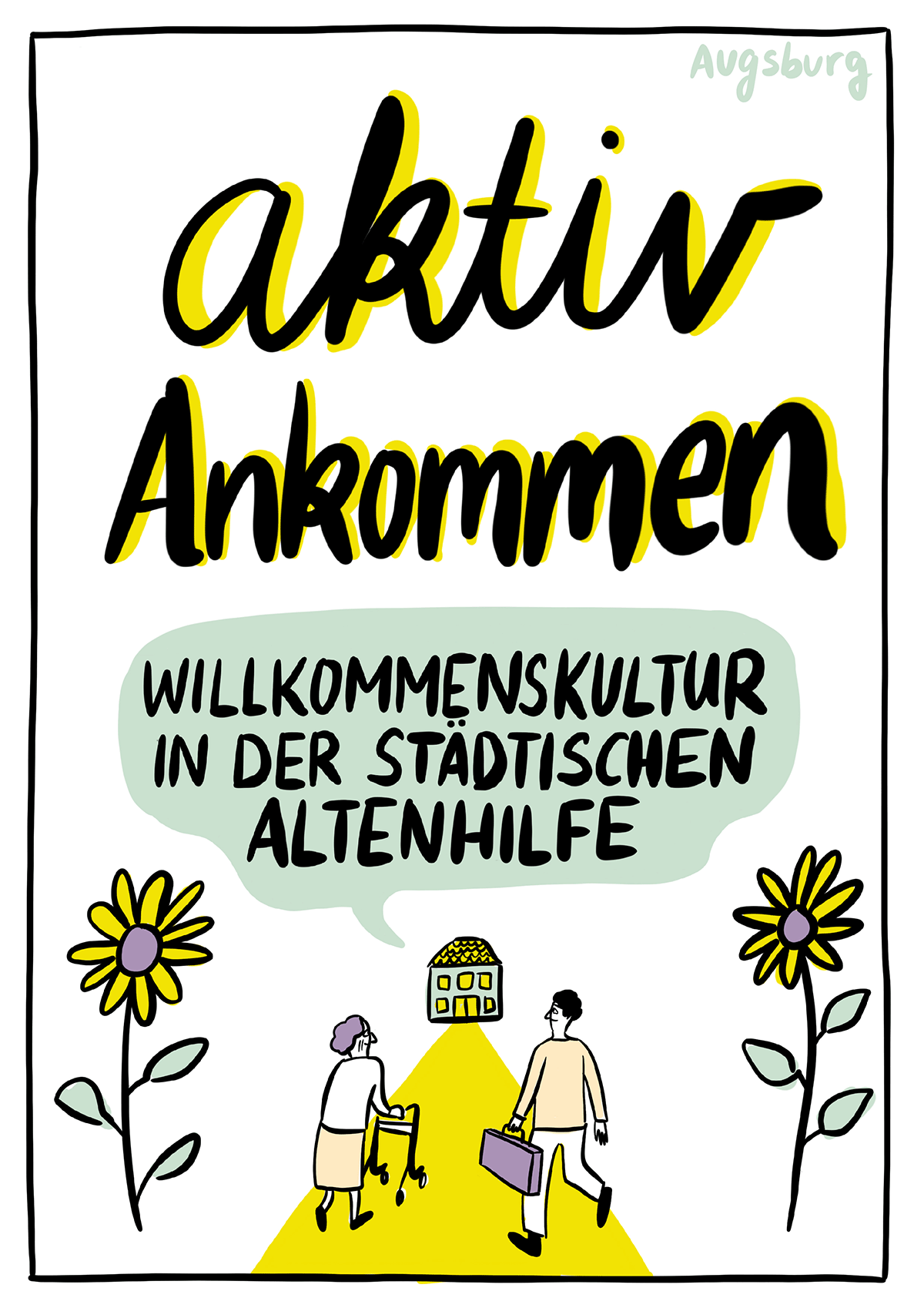 Digitales Visual Recording, Brainstorming zum Thema Willkommenskultur in der städtischen Altenhilfe.Die Illustrationen wurden hinterher in einer Broschüre abgedruckt, die als Einladung zum gleichnamigen Workshop diente.